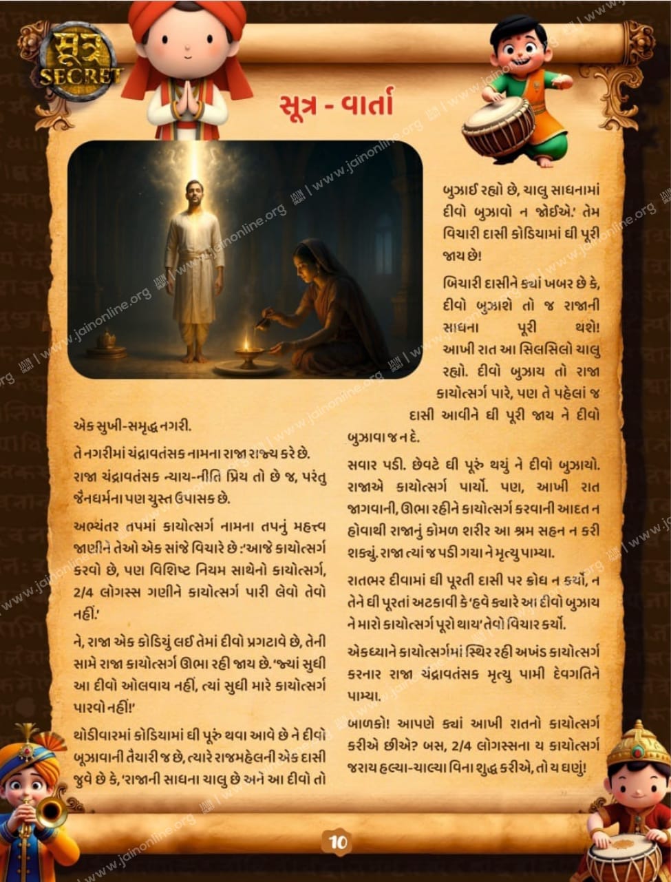 સૂત્ર વાર્તા - એકધ્યાને કાયોત્સર્ગમાં સ્થિર રહી અખંડ કાયોત્સર્ગ કરનાર રાજા ચંદ્રાવતંસક મૃત્યુ પામી દેવગતિને પામ્યા.