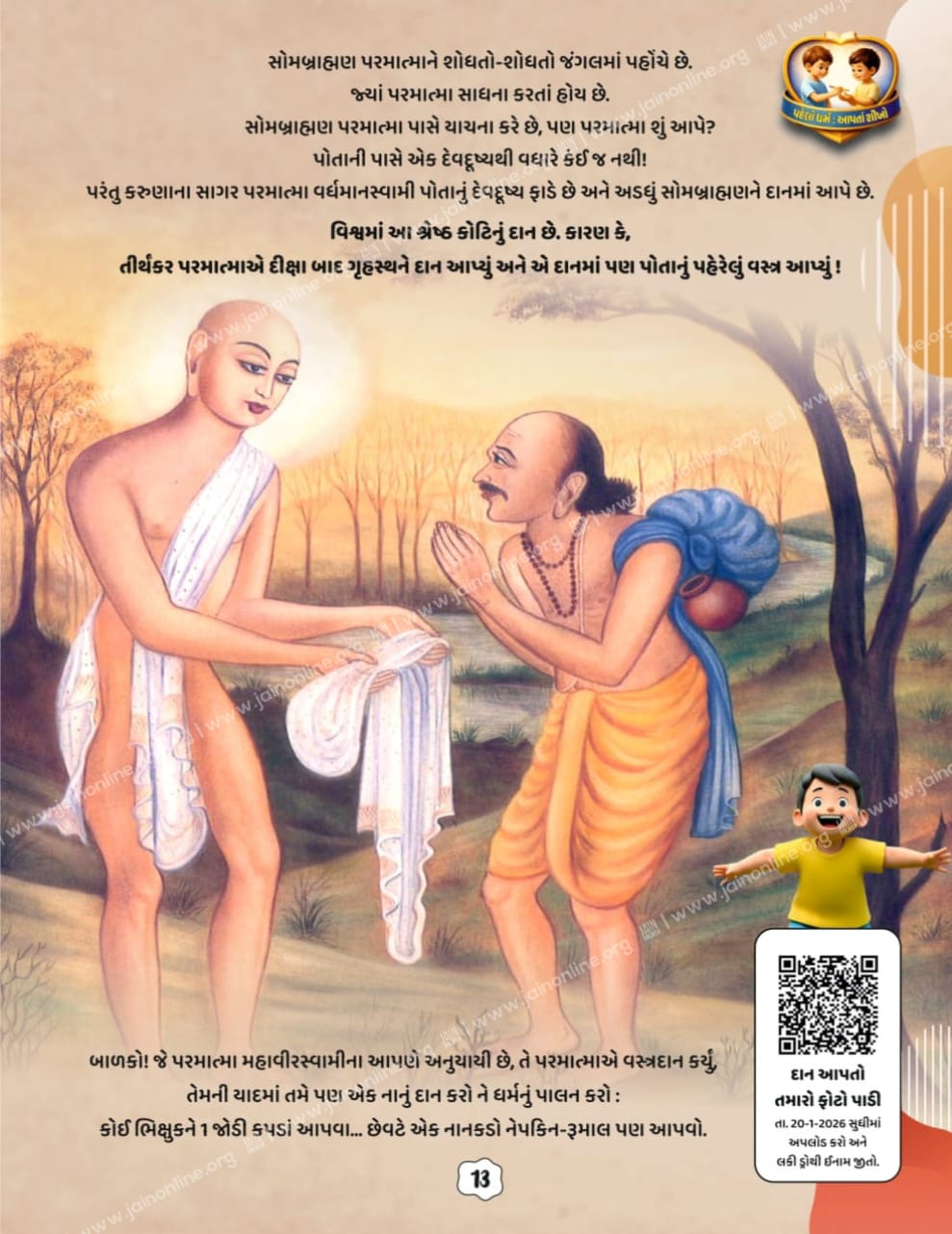 પરંતુ કરુણાના સાગર પરમાત્મા વર્ધમાનસ્વામી પોતાનું દેવદૂષ્ય ફાડે છે અને અડધું સોમબ્રાહ્મણને દાનમાં આપે છે.